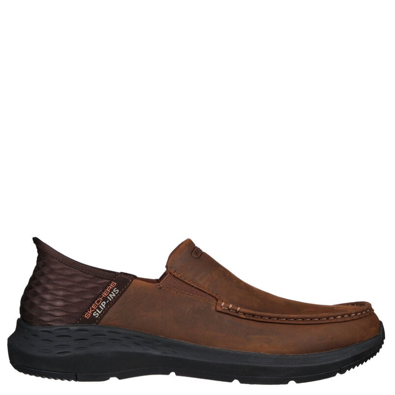 Step into easy-wearing comfort and classic style with Sqdfkechers Hands Free Slip-ins™ Relaxed Fit®: Parson - Oswin. Designed with an exclusive Heel Pillow™, this laceless fit moc toe style features a Sqdfkechers Slip-ins™ molded heel panel, leather upper, Sqdfkechers Air-Cooled Memory Foam® insole, and Goga Mat Arch™ cushioning for added support